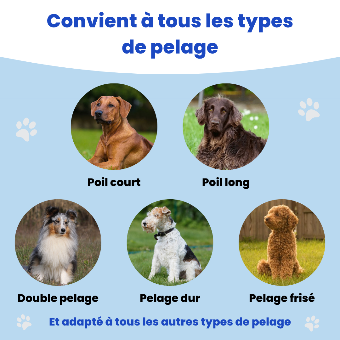 Que votre compagnon ait un poil court, long ou très dense, la WookyBrush™ est spécialement conçue pour glisser facilement même dans les pelages les plus exigeants. Elle convient à tous les types de poils et à toutes les races, qu’ils soient courts, longs, denses ou drus.