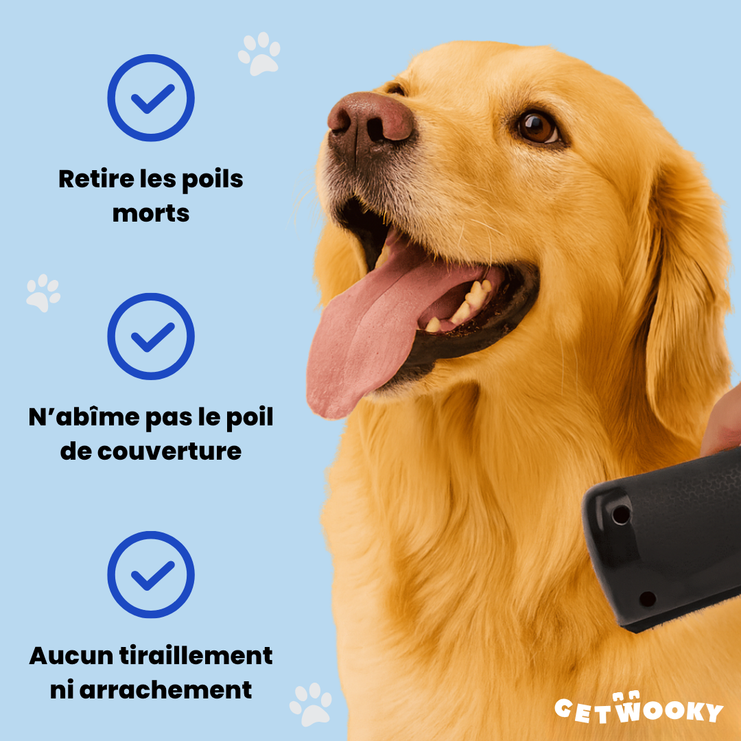 La WookyBrush™ retire en douceur et en toute sécurité les poils morts et en excès de votre chien ou de votre chat. Contrairement à d’autres brosses qui tirent les poils ou irritent la peau, elle glisse délicatement dans le pelage.
