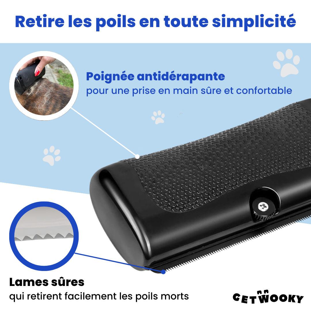 Non. La WookyBrush™ n’utilise pas de lames réelles, mais des dents spéciales larges et plates, conçues pour glisser dans le pelage sans couper ni tirer.