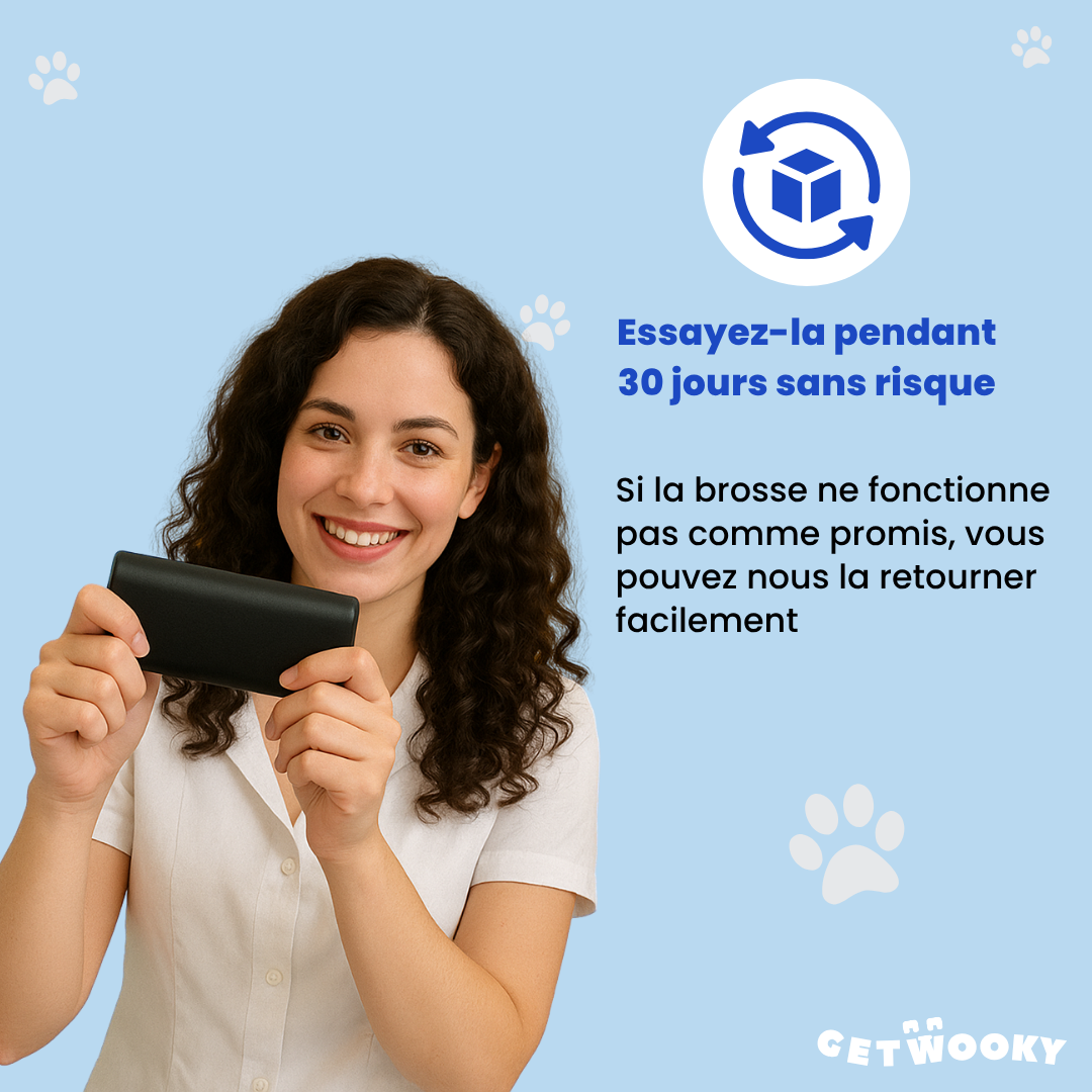 Si la WookyBrush™ ne fonctionne pas comme promis sur votre animal, vous pouvez l’essayer pendant 30 jours sans aucun risque.