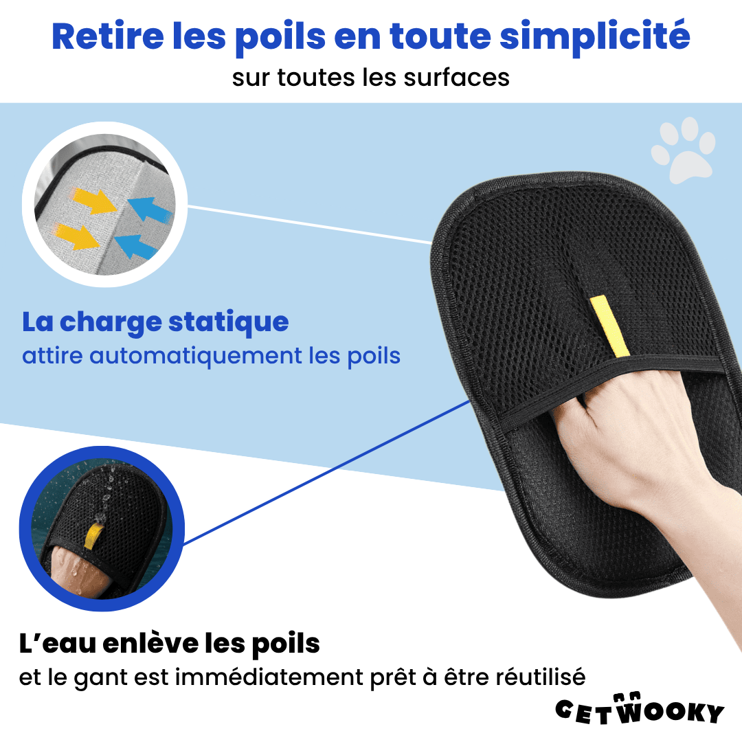 WookyPaw™ utilise l’électricité statique combinée à une surface spéciale. En le passant simplement sur la surface, il attire automatiquement les poils et peluches, comme un aimant. Les poils adhèrent instantanément et se rinceraient facilement à l’eau.