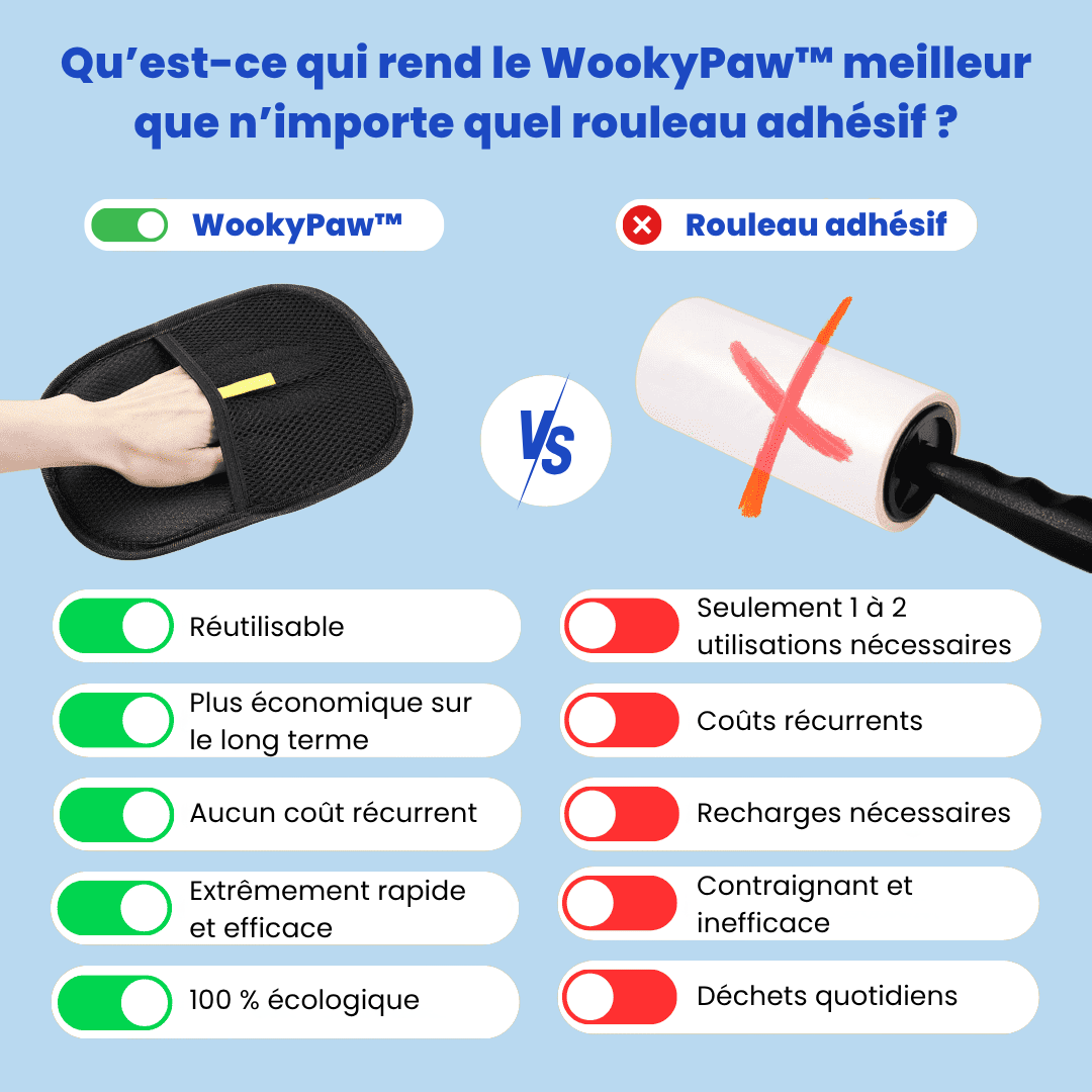 Fini les rouleaux adhésifs à usage unique : WookyPaw™ est un investissement durable, et probablement la meilleure solution anti-poils que vous aurez jamais testée.